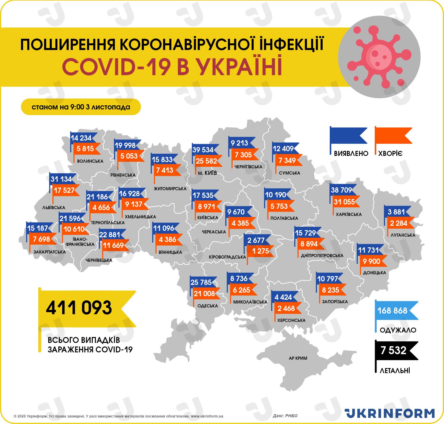 В Украине по состоянию на 3 ноября лабораторно подтвердили 411 093 случая COVID-19, из них за сутки — 8 899.