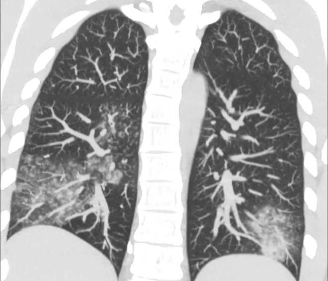 «Рентгенологические изменения неспецифичны: «матовое стекло», ателектазы, гиперраздутые лёгкие, иногда – консолидация. Чаще двусторонние поражения (смотрите фото)», — информирует инфекционист.